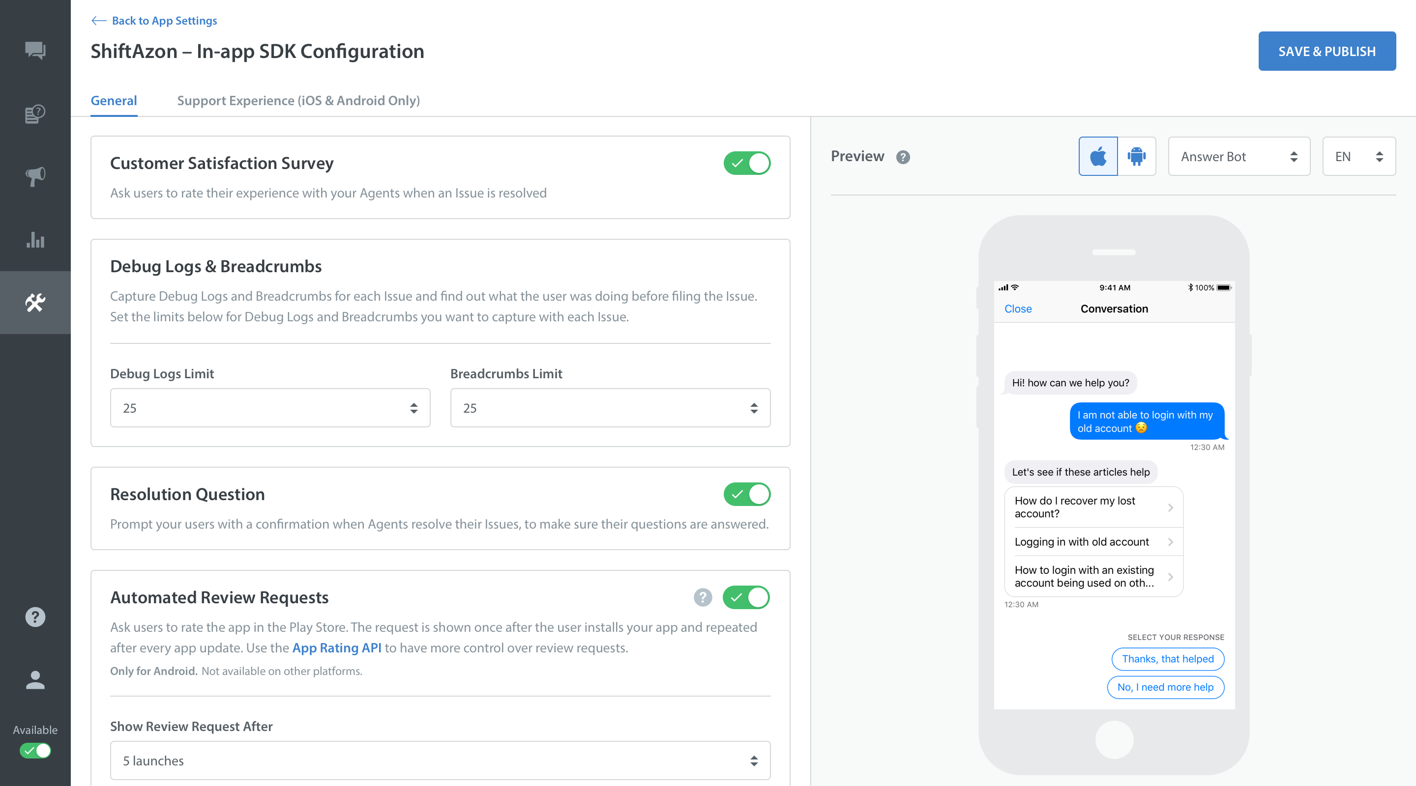 Customer satisfaction survey prompts your app users to rate their customer support experience with your agents. Enabling it, sends out a 5-star customer service rating request to your customers when an issue is resolved.