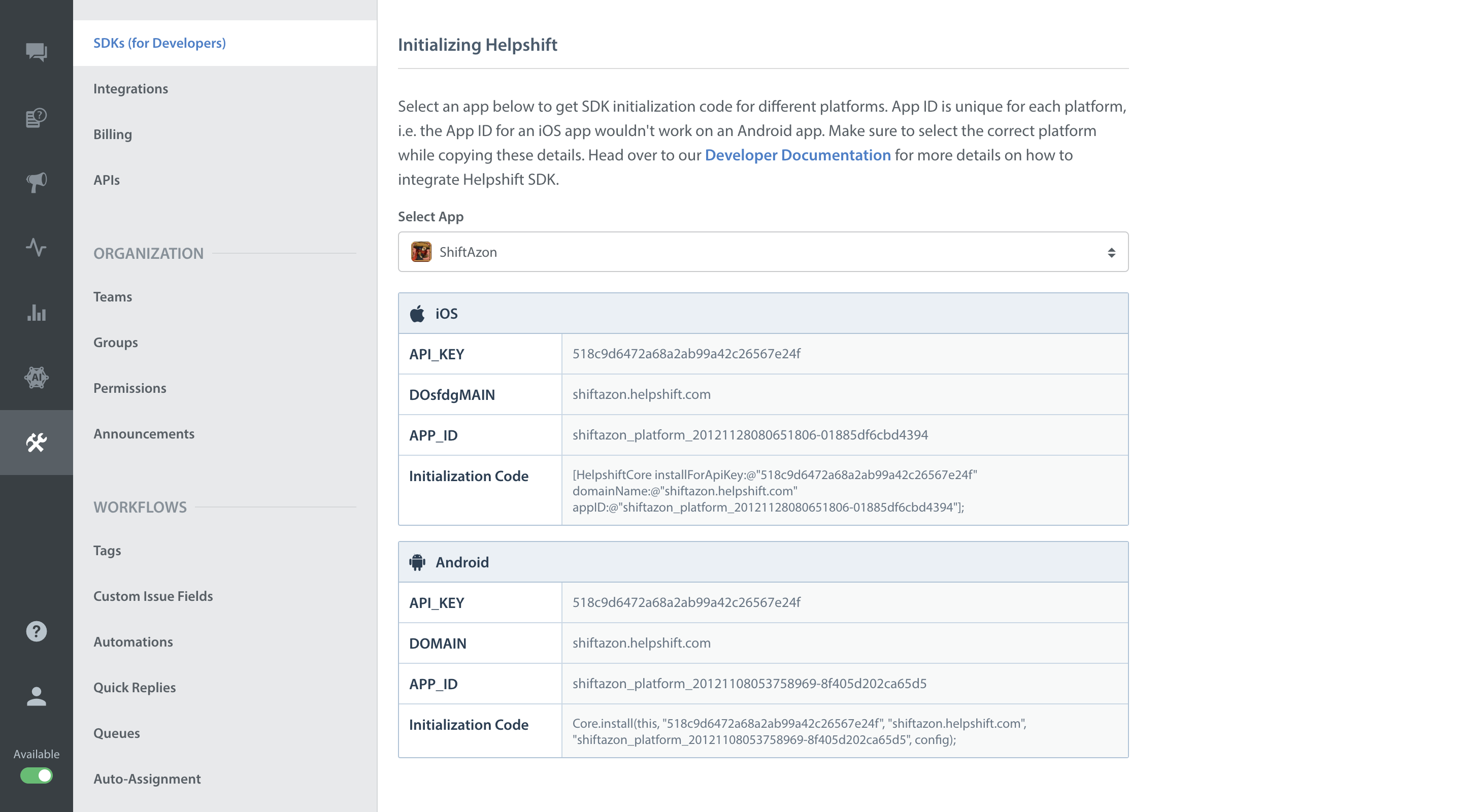 HelpshiftDemoActivity.javainitialize Helpshift with your uniqueAPI_KEY,DOMAINandAPP_ID. To get them:Navigate to
