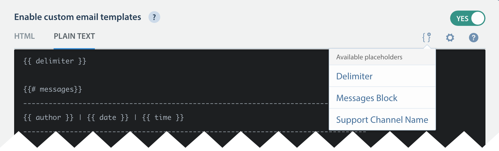 {{ support_channel_name }} | Brings the name of your email support channel. This is useful for making email footers where you might want to add a signature, say "-- Happy Apps Support" |