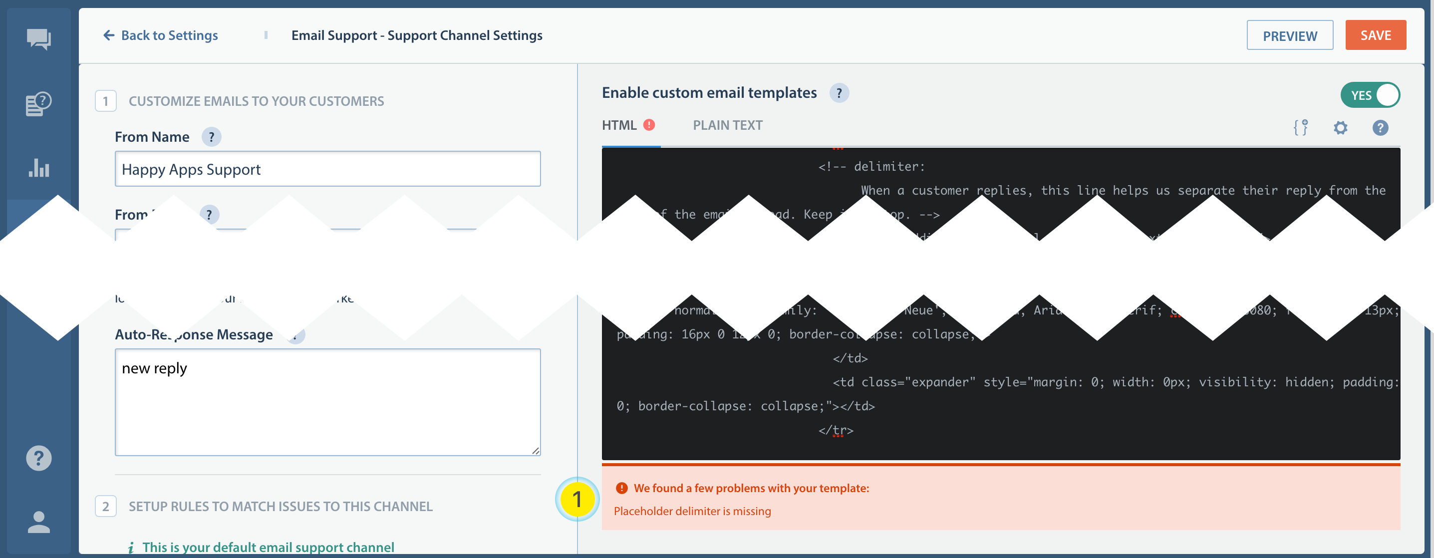 When you save or preview, the email templates are also validated for any missing placeholders that are mandatory. More about them later.