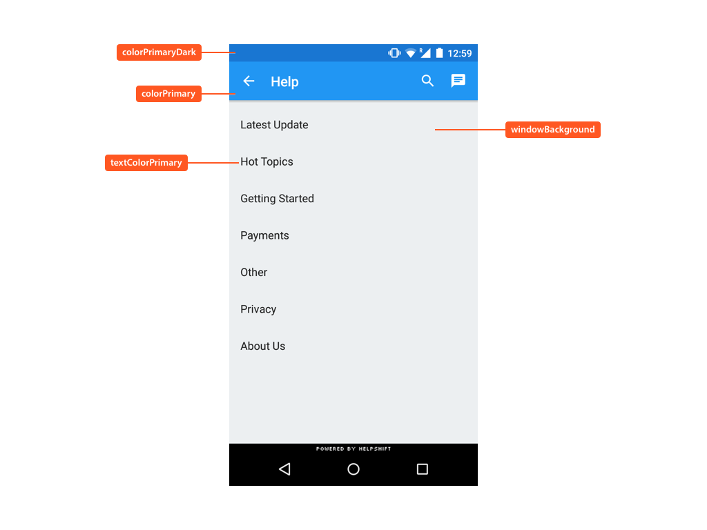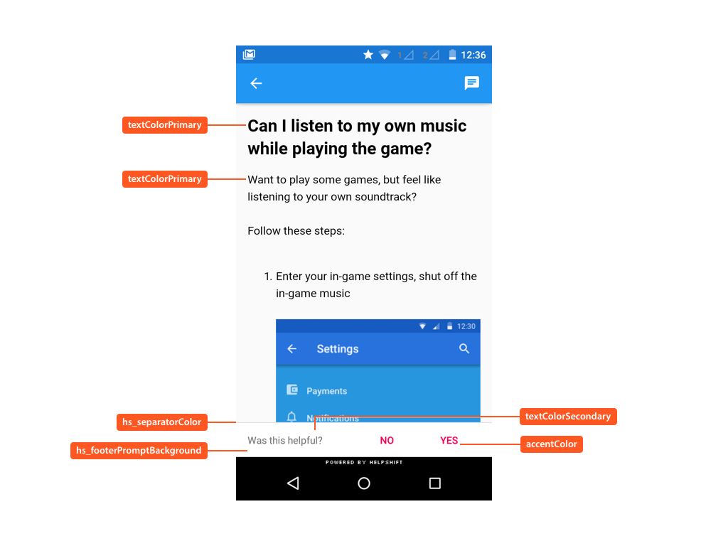 The following illustrates use of these styleable attributes over Helpshift SDK's UI: