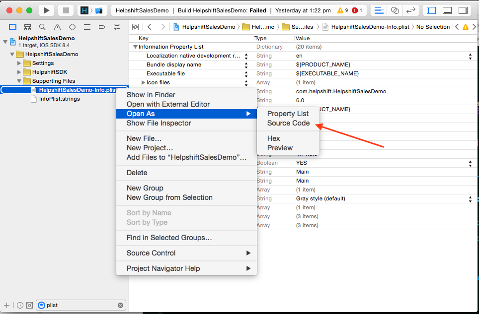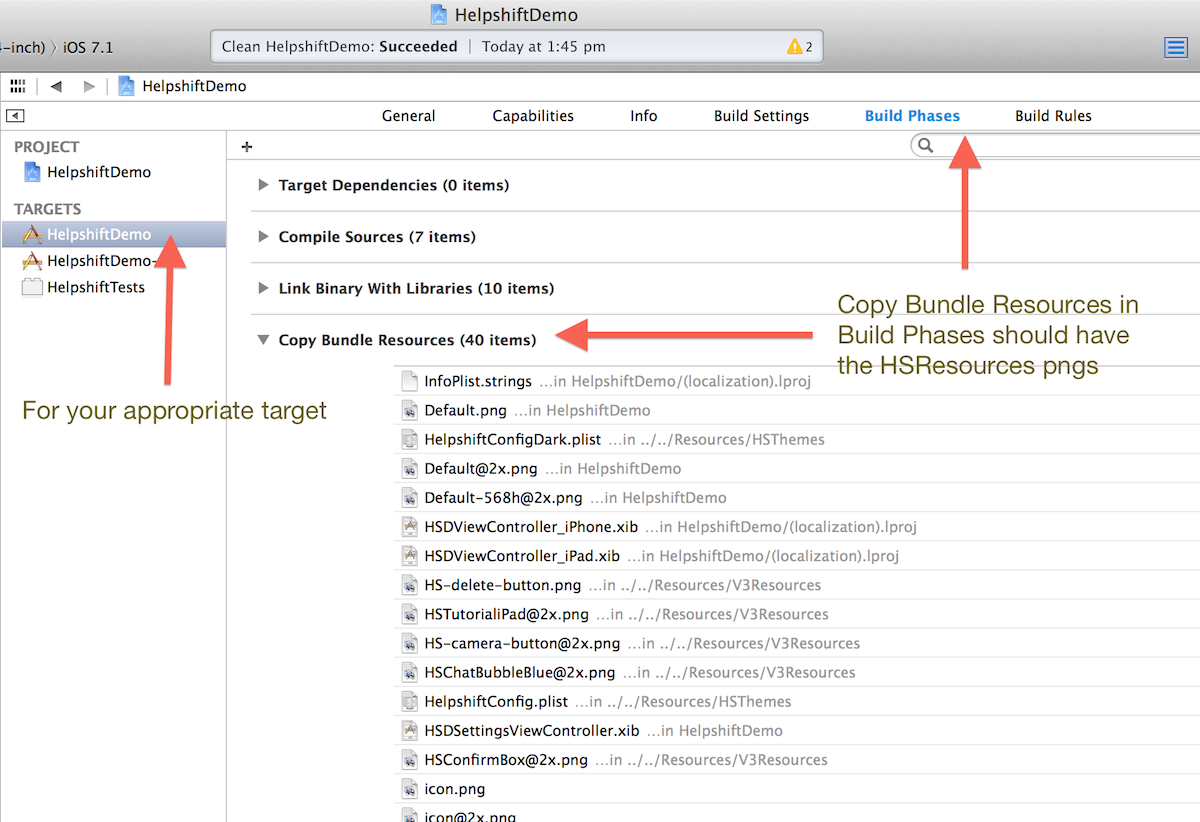 • Make sure that HelpshiftConfig.plist is correctly imported into your Xcode project. It should shown under Build Phases > Copy Bundle Resources for your target. To make sure that your project is picking up the plist correctly, you can run the following snippet in your project:
