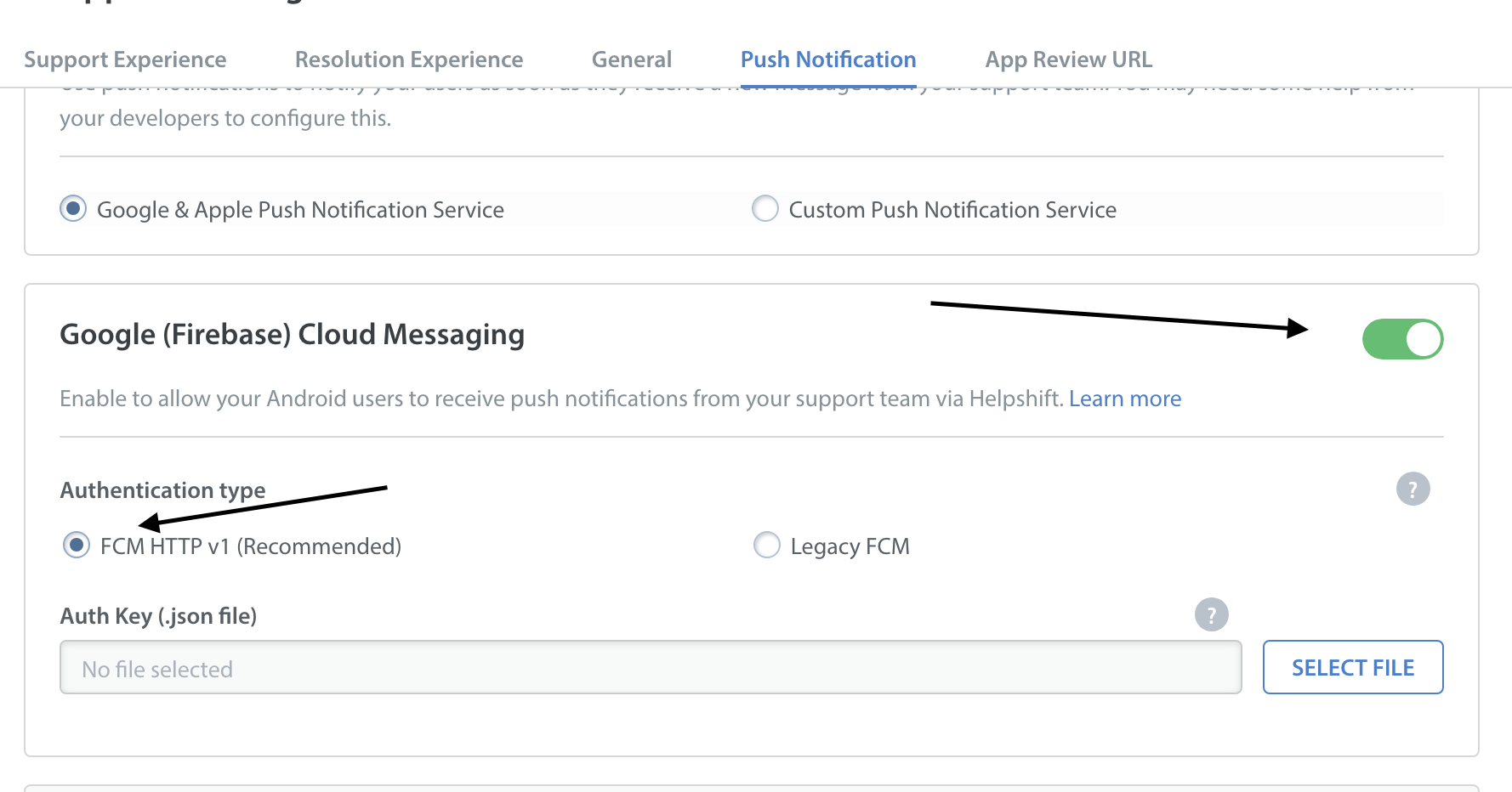 Enter your FCM key credentials per app, via the Settings page > Scroll down to App Settings the left pane > Select your App > Under Supported Platforms iOS/Android > Click Configure > Select Push Notification section.
